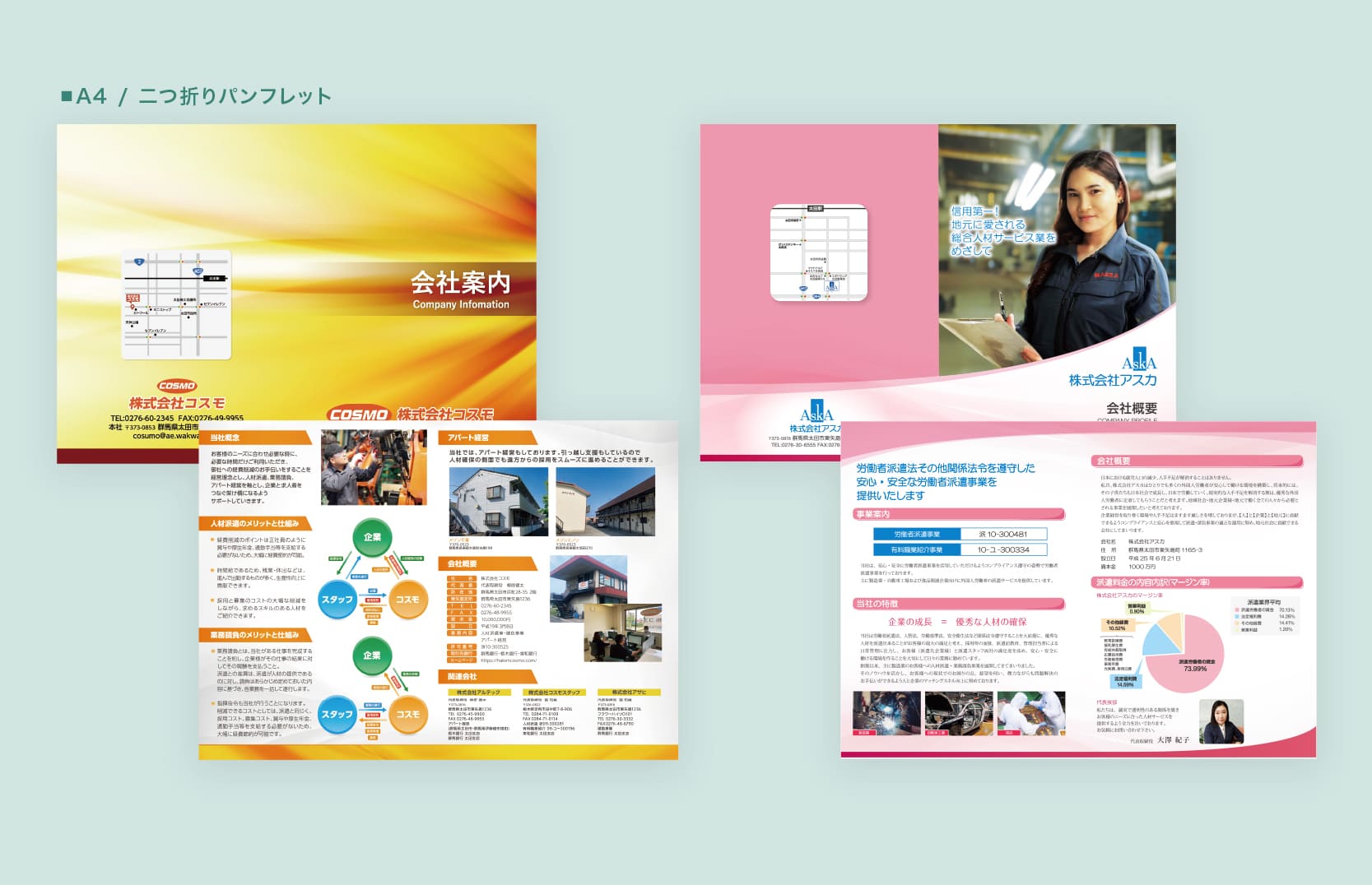 株式会社アスカ様の会社パンフレットを作成いたしました。派遣に向かう方々を女性というイメージで想定し、デザイン全体を女性らしく、少し年齢層が高めの雰囲気に仕上げました。
