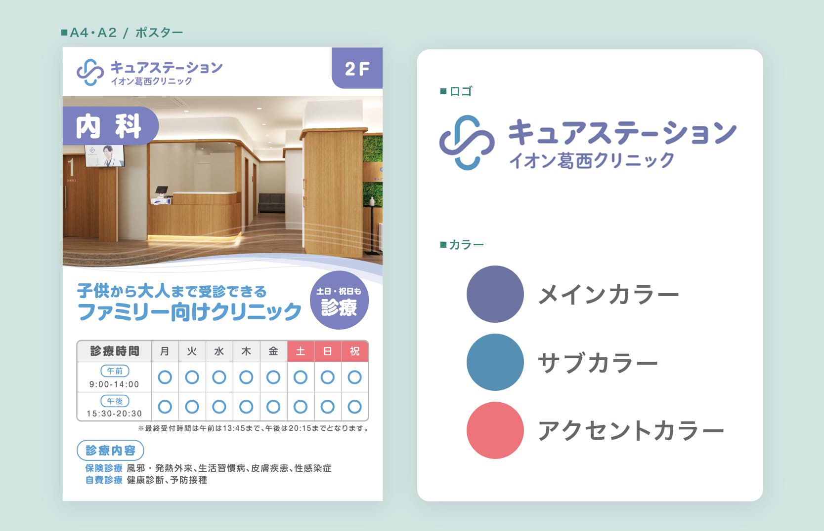 デザインコンセプトは「子供から大人まで受診できる」というキャッチコピーに基づき、柔らかく丸みを帯びたデザインで、統一感を持たせました。