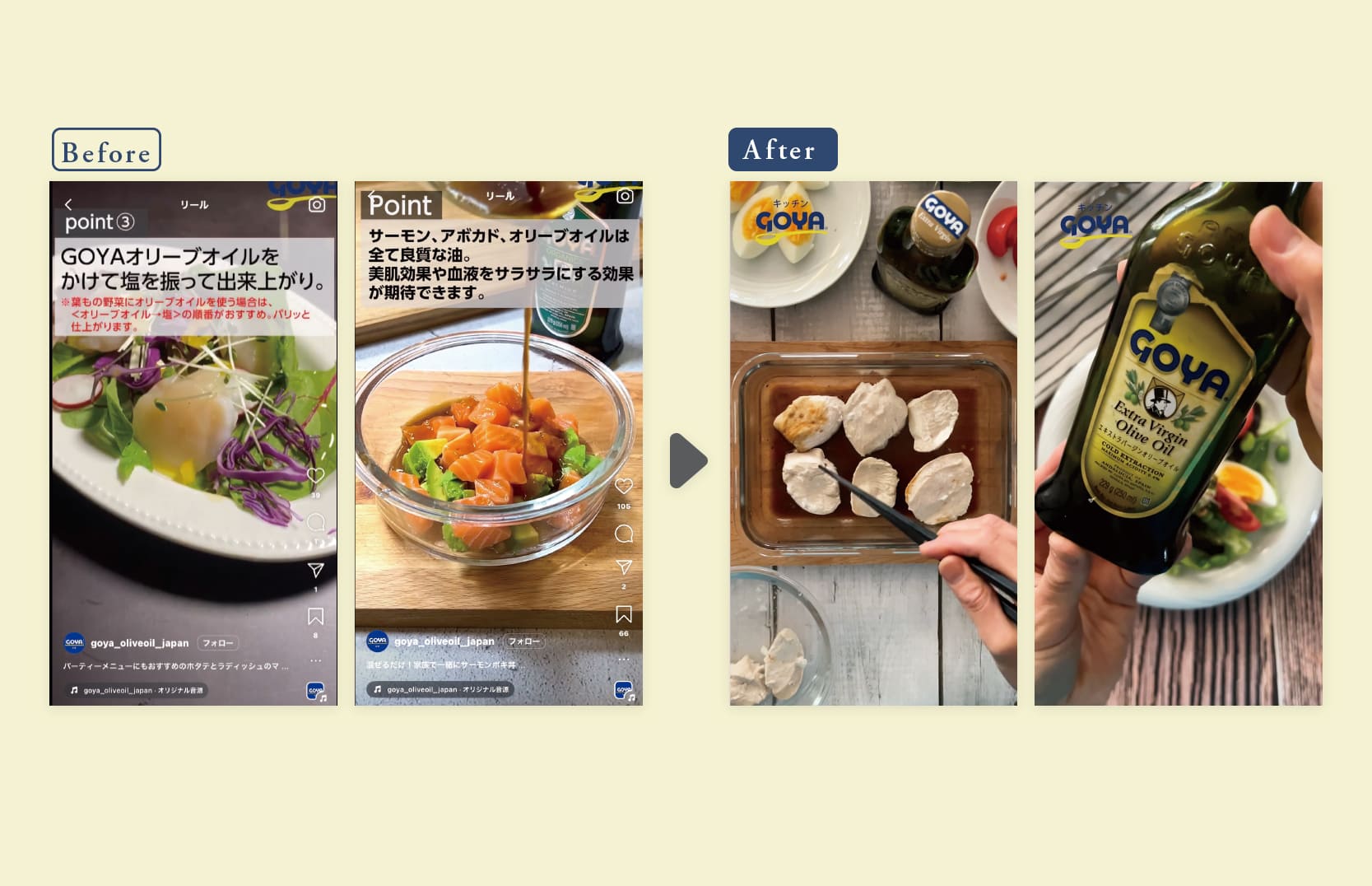 コンセプト:「オリーブオイルを日本の皆さんにも親しんでほしい」という依頼企業の希望を踏まえ、忙しい主婦でも手軽に料理に取り入れられるように工夫しました。動画では、オリーブオイルが「美味しそう」と感じてもらえるような演出にこだわりました。
