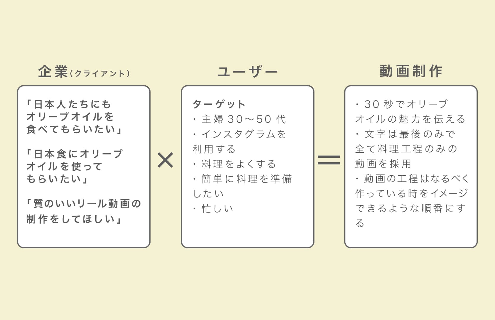 コンセプト:「オリーブオイルを日本の皆さんにも親しんでほしい」という依頼企業の希望を踏まえ、忙しい主婦でも手軽に料理に取り入れられるように工夫しました。動画では、オリーブオイルが「美味しそう」と感じてもらえるような演出にこだわりました。